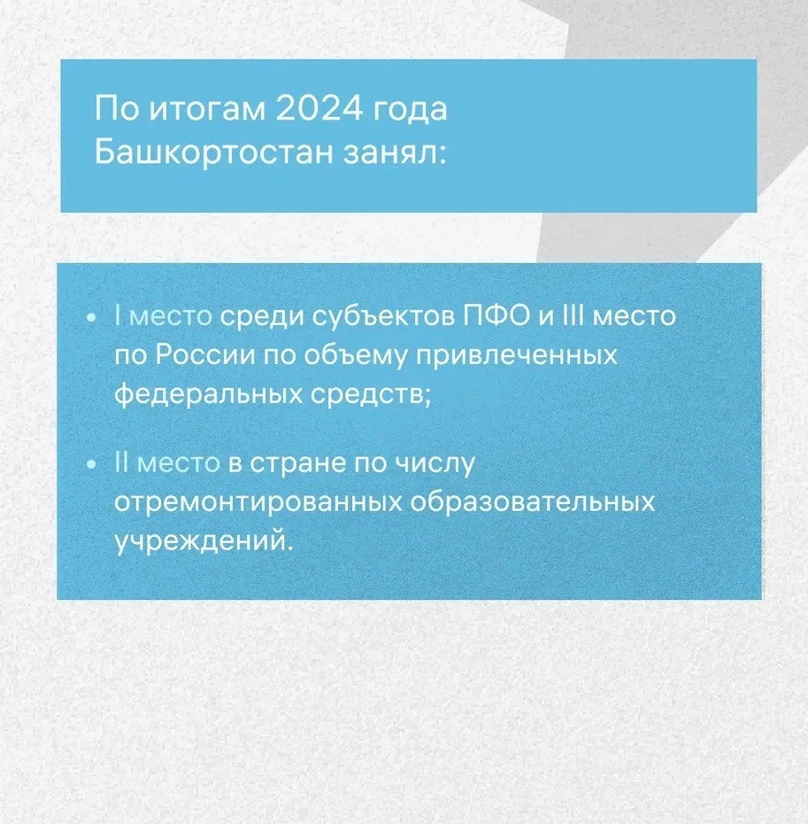 С 2019 по 2024 год в Башкирии построили и ввели в эксплуатацию 48 школ и 65 детсадов по нацпроекту «Образование». Регион стабильно входит в число лидеров страны по темпам строительства и реконструкции образовательных объектов.