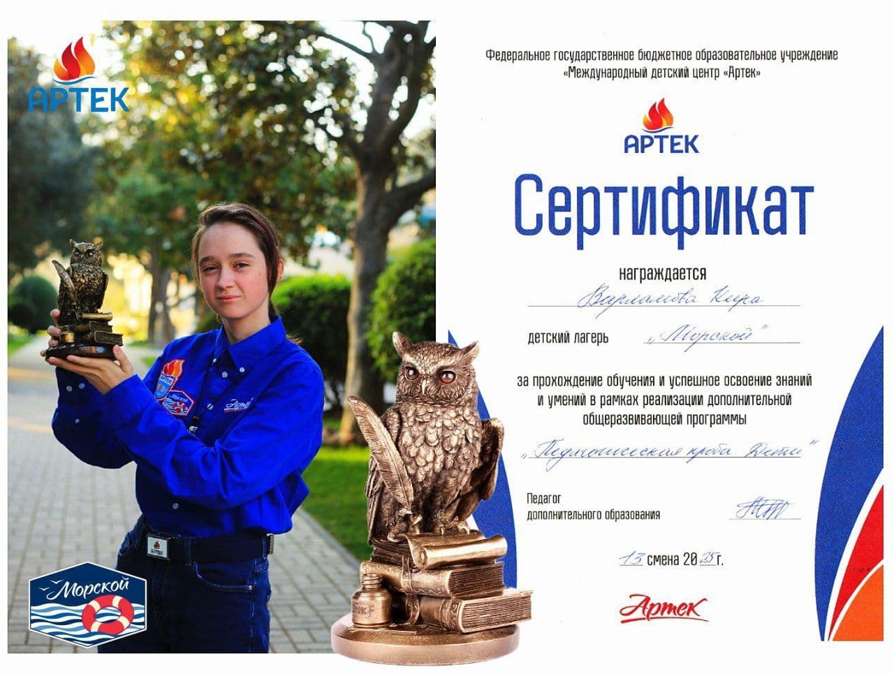 В «Танцевальном баттле» лагерь «Морской» стал победителем, в музыкальном конкурсе «Поверь в мечту!» завоевал Гран-при, а в финале смены одержал победу и в «Педагогической битве», так что символ науки и образования – сова, завоёванная их предшественниками с 12 смены, – осталась «дома».